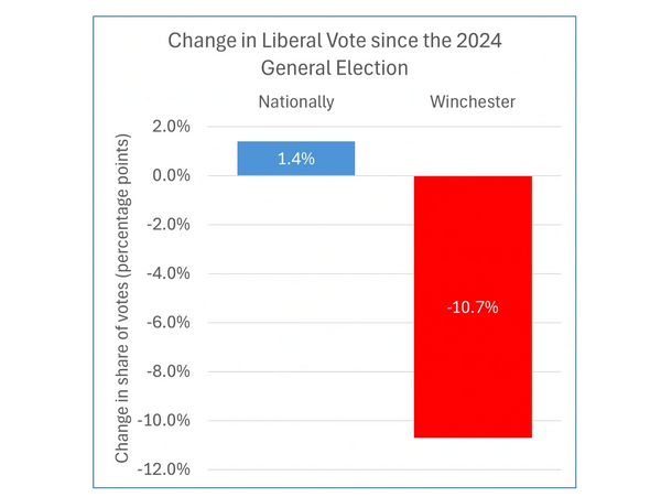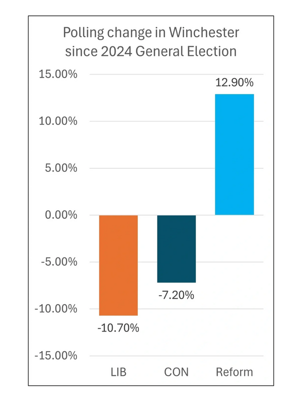 Although the Liberal vote nationally is currently up by 1.4 percentage points higher since the last election (Reform up 15.3 percentage points), the story in Winchester is completely different. The share of votes predicted is 10.7 percentage points lower for the Liberal party in Winchester (source: www.electoralcaclulus.co.uk).